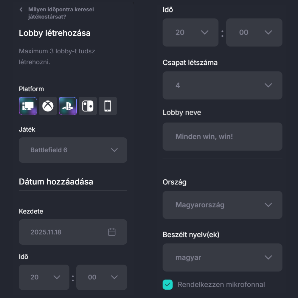 Beállítod, hogy milyen platformon játszotok. Kiválasztod a játékot. Megadod, mennyien legyenek a csapatban. Nevet adsz a lobbinak, pontos időpontot, meddig lehet csatlakozni, milyen nyelven beszéljenek, honnan jöjjenek a játékosok. Ha akarod, az életkort is meghúzod, hogy ne a 12 éves headset-sikoly legyen az este háttérzaja, hanem normális kommunikáció. Pipálod, hogy legyen mikrofon. Vagy épp nem, ha casual chill a cél.