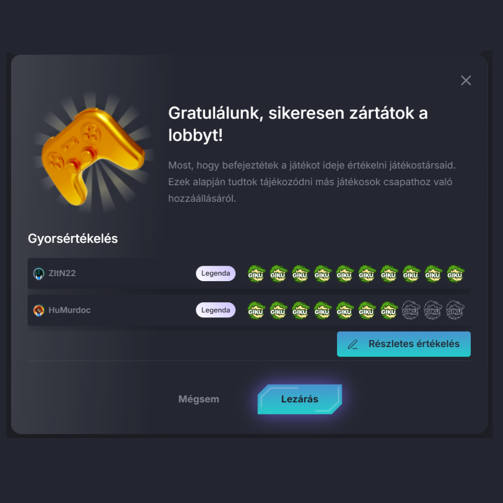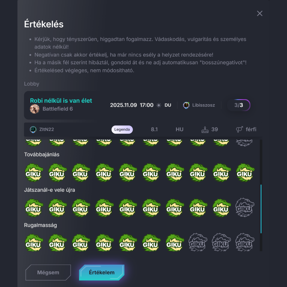 Ezek az értékelések szépen felkúsznak a játékoskártyákra. Legközelebb, amikor valakit meglátsz egy lobbyban vagy jelentkezőként, már nem vakon döntesz: ott virítanak a pontok. Tudod, hogy kivel érdemes játszani, és kit jobb elengedni. A GIKU-ban a hírneved nem pofázásból van, hanem abból, ahogyan játszol másokkal.
