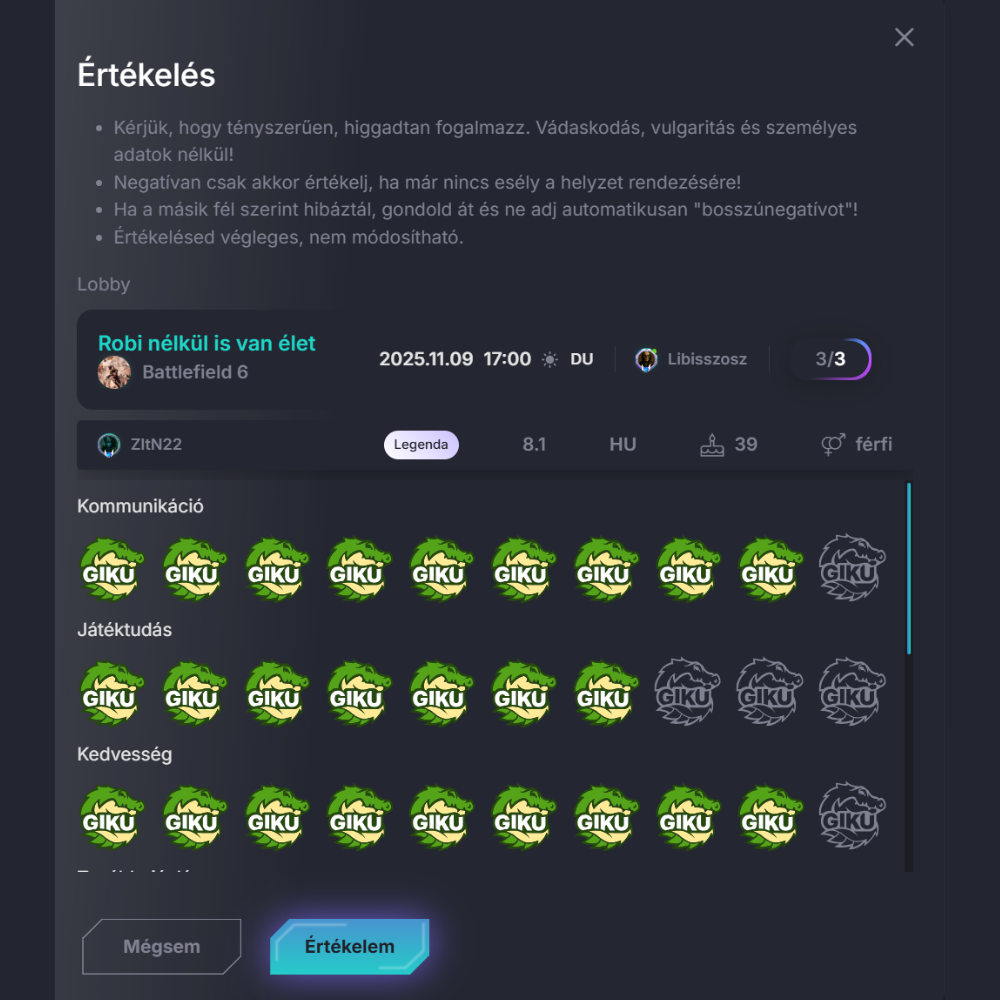 A lobby tulajaként elindítod az értékelési folyamatot, és mindenki pontozhat mindenkit. Nem csak annyi, hogy „jófej volt” vagy „toxikus”, hanem ha akarjátok, részletesen: mennyire volt csapatjátékos, kommunikált-e normálisan, tartotta-e magát a megbeszéltekhez, rageelt-e, lelépett-e idő előtt stb.